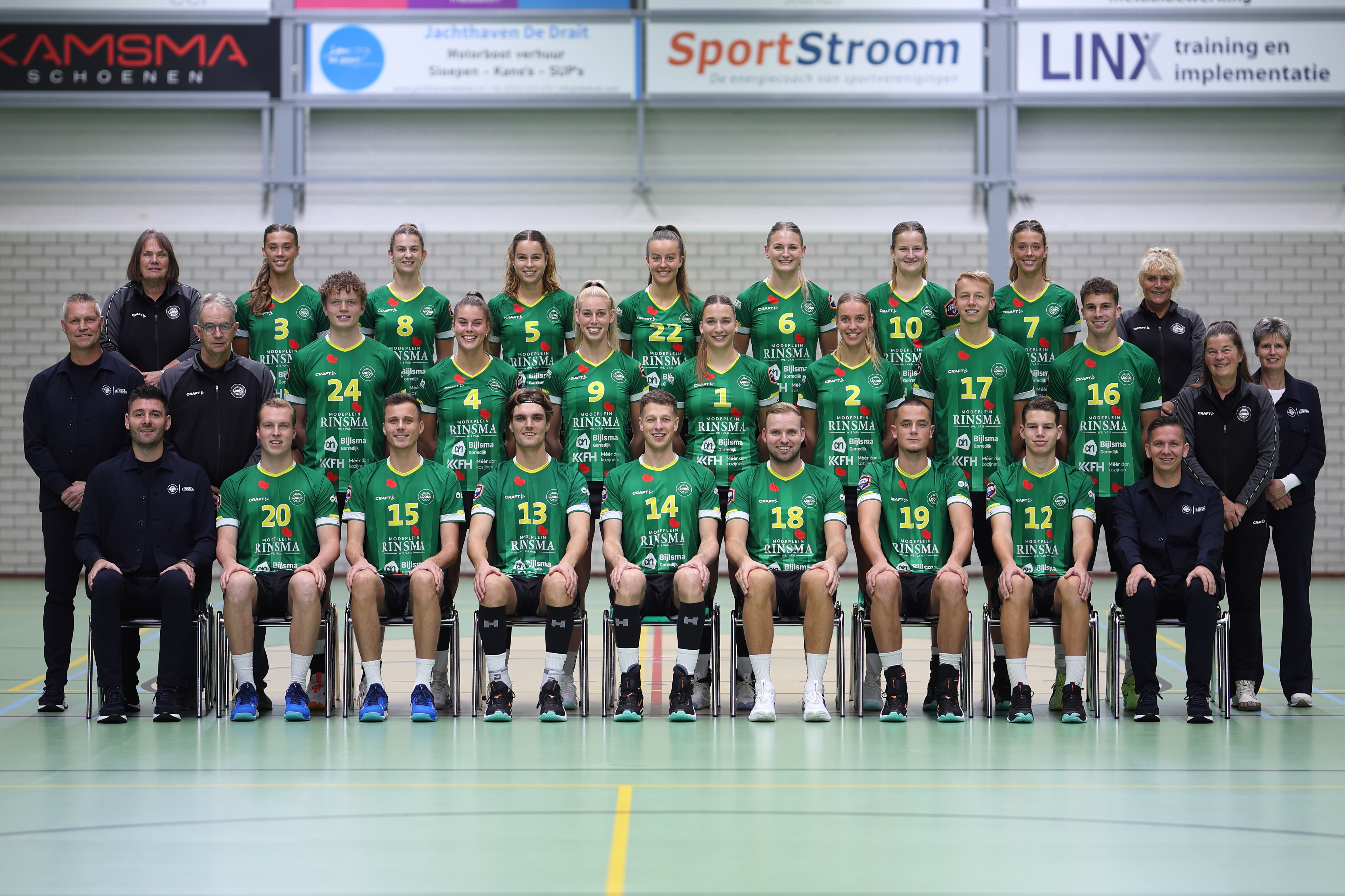 Middelste rij; coach Jan Jouke Flokstra, hoofdcoach Jan Niebeek, verzorgster Selma Boonstra, Marije Visser, 3 Danique Klaren, 9 Rixt Bouma, 4 Marlou Kuipers, 6 Femke Faber, 2 Esmee Van Veen, staticus/video Bert De Vreede, hoofdcoach 2 Jordy Last, assistent coach 1 Rudmer de Groot.