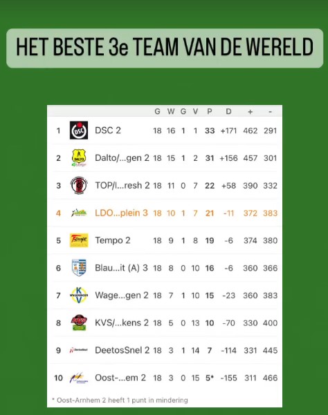 Het derde staat nu op de tweede plaats en speelt vandag tegen DOS 46 2 . de vorige wedstrijd werd door LDODK 3 gewonnen.